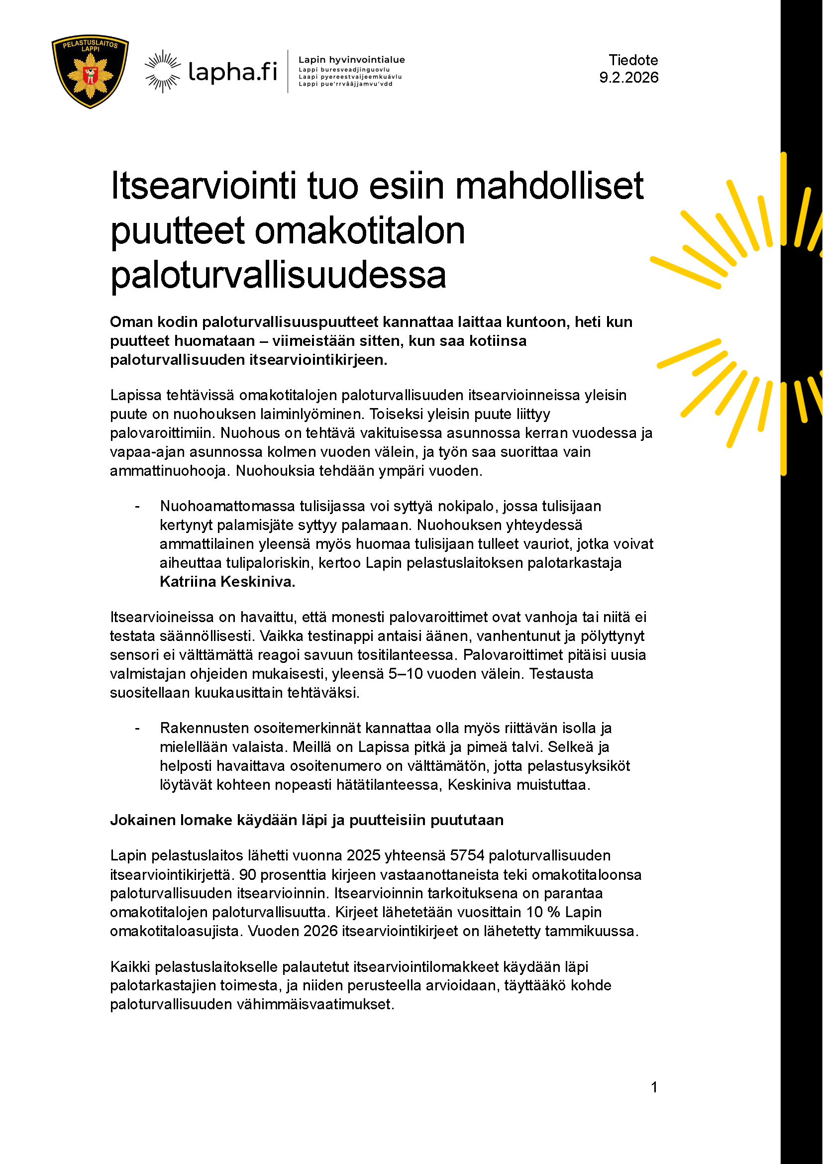 Julkaistu 9.2.2026 Muokattu 9.2.2026Oman kodin paloturvallisuuspuutteet kannattaa laittaa kuntoon, heti kun puutteet huomataan – viimeistään sitten, kun saa kotiinsa paloturvallisuuden itsearviointikirjeen.