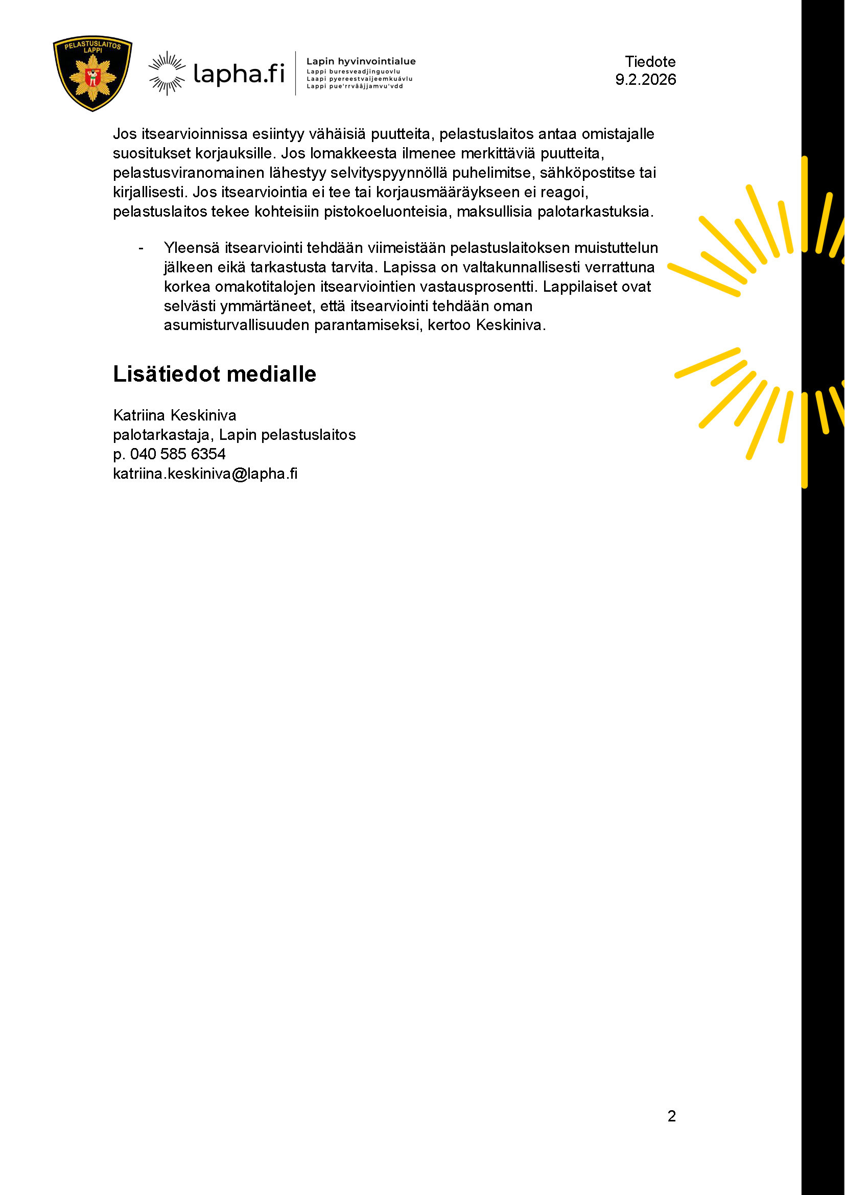 Julkaistu 9.2.2026 Muokattu 9.2.2026Oman kodin paloturvallisuuspuutteet kannattaa laittaa kuntoon, heti kun puutteet huomataan – viimeistään sitten, kun saa kotiinsa paloturvallisuuden itsearviointikirjeen.
